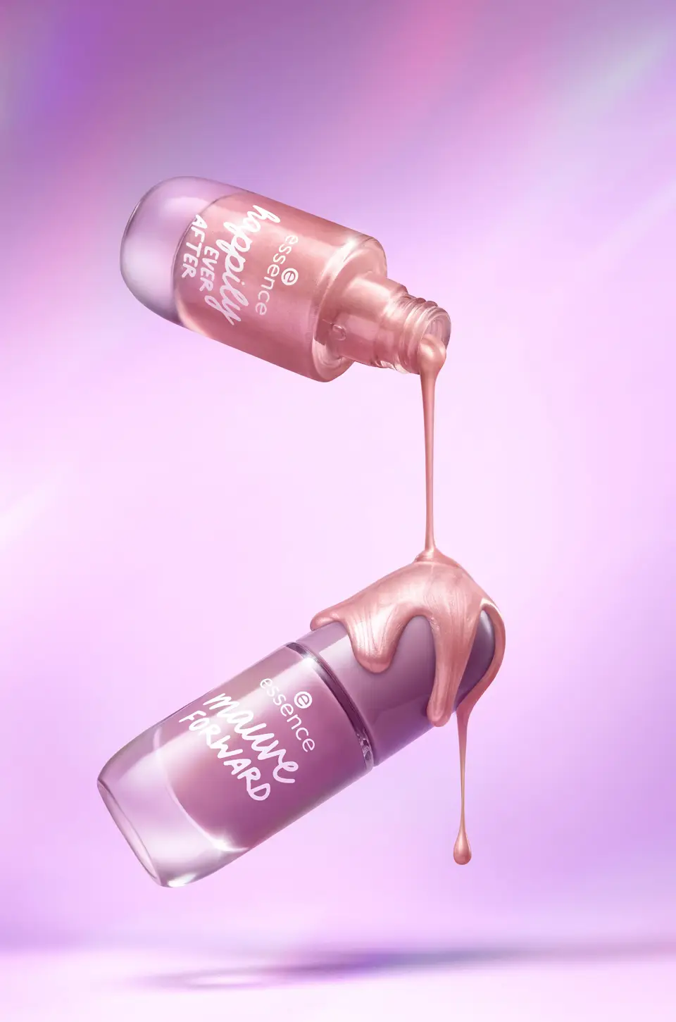 A classic product photography ad of a hovering nail polish with liquid running down the beautiful bottle. Retouched in Photoshop. Spiced up with some glares and a colorful background.