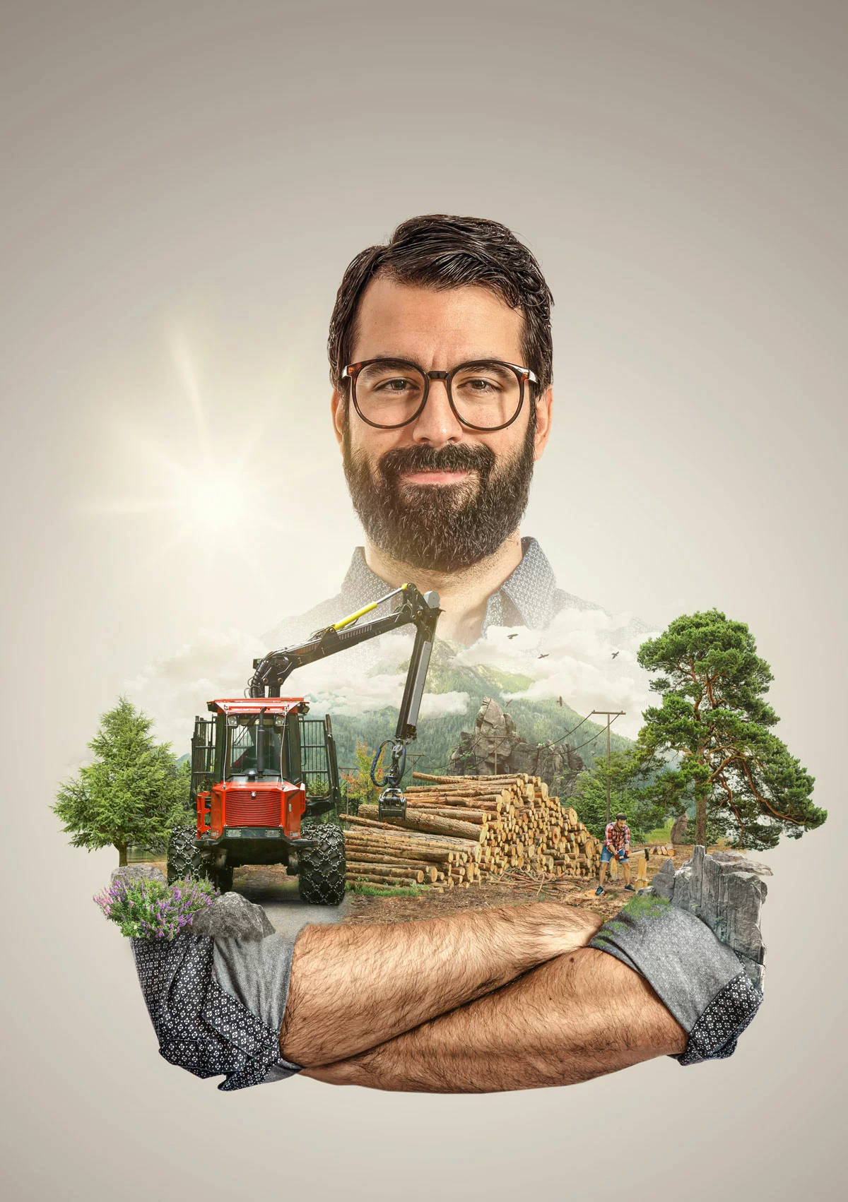 This work shows a proud, friendly entrepreneur united with his wood processing company. A free advertising image that beautifully combines two worlds. The entrepreneur in the portrait was visually staged with the core of his company through creative advertising photography, retouching, and skillful image editing. Tree trunks and excavators stand on his crossed arms, with mountains in the background. Definitely a reason to be proud.