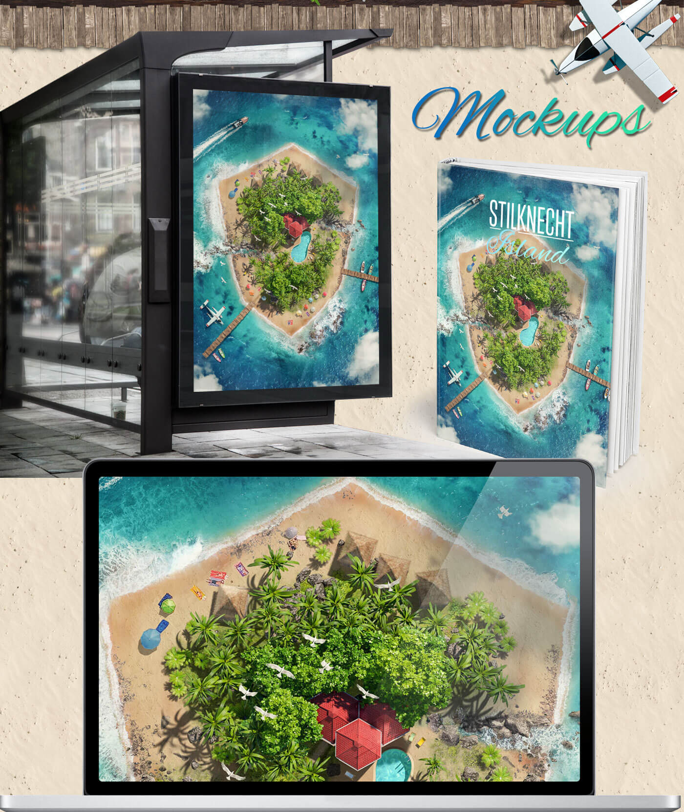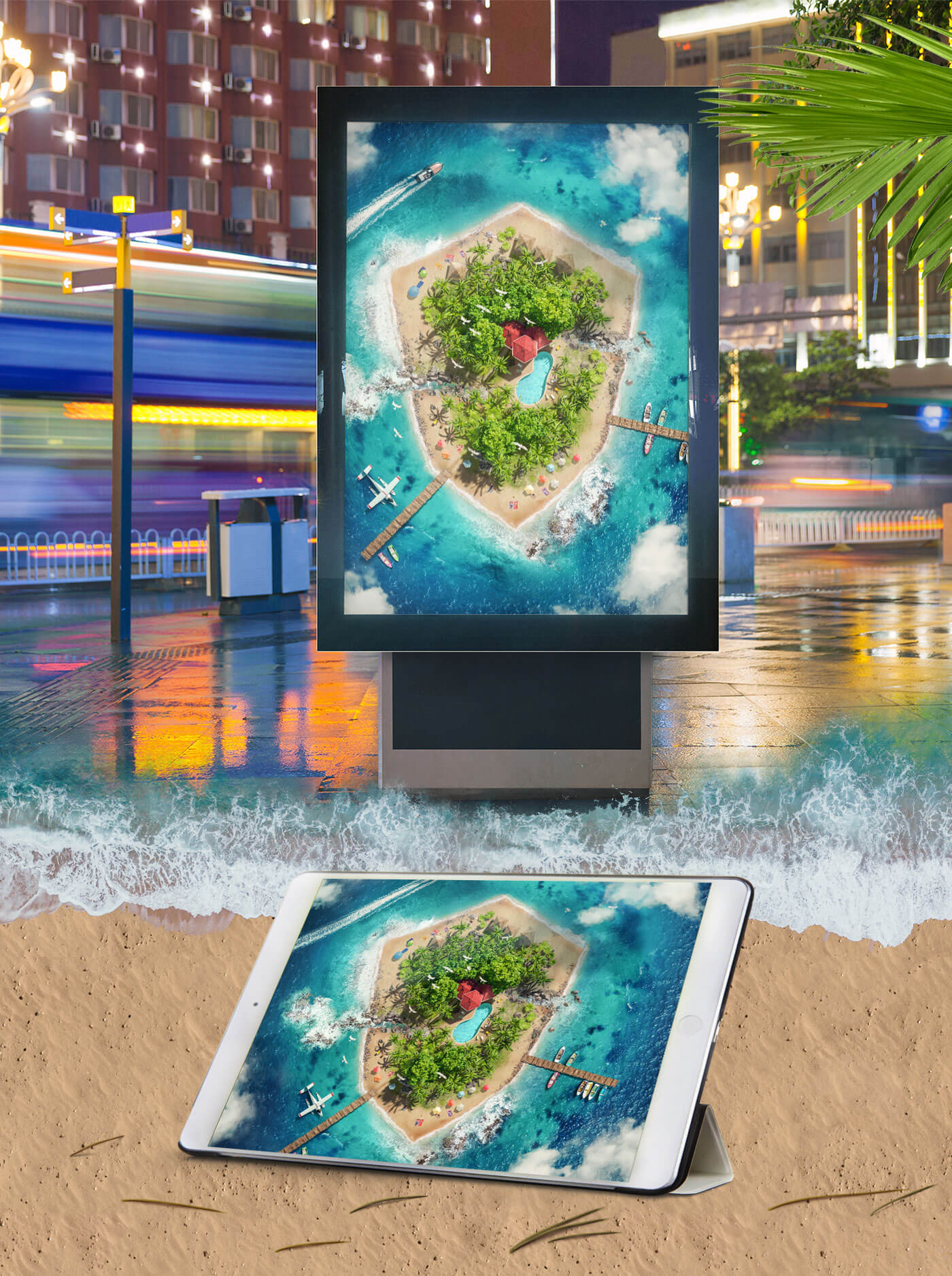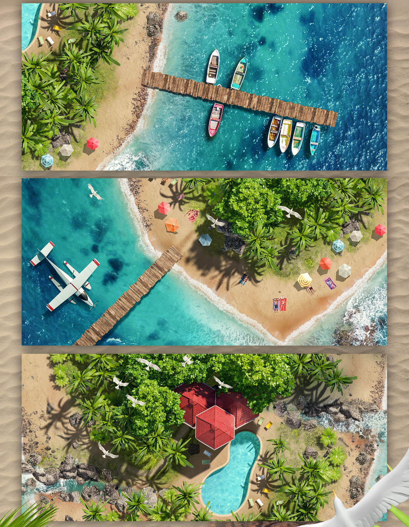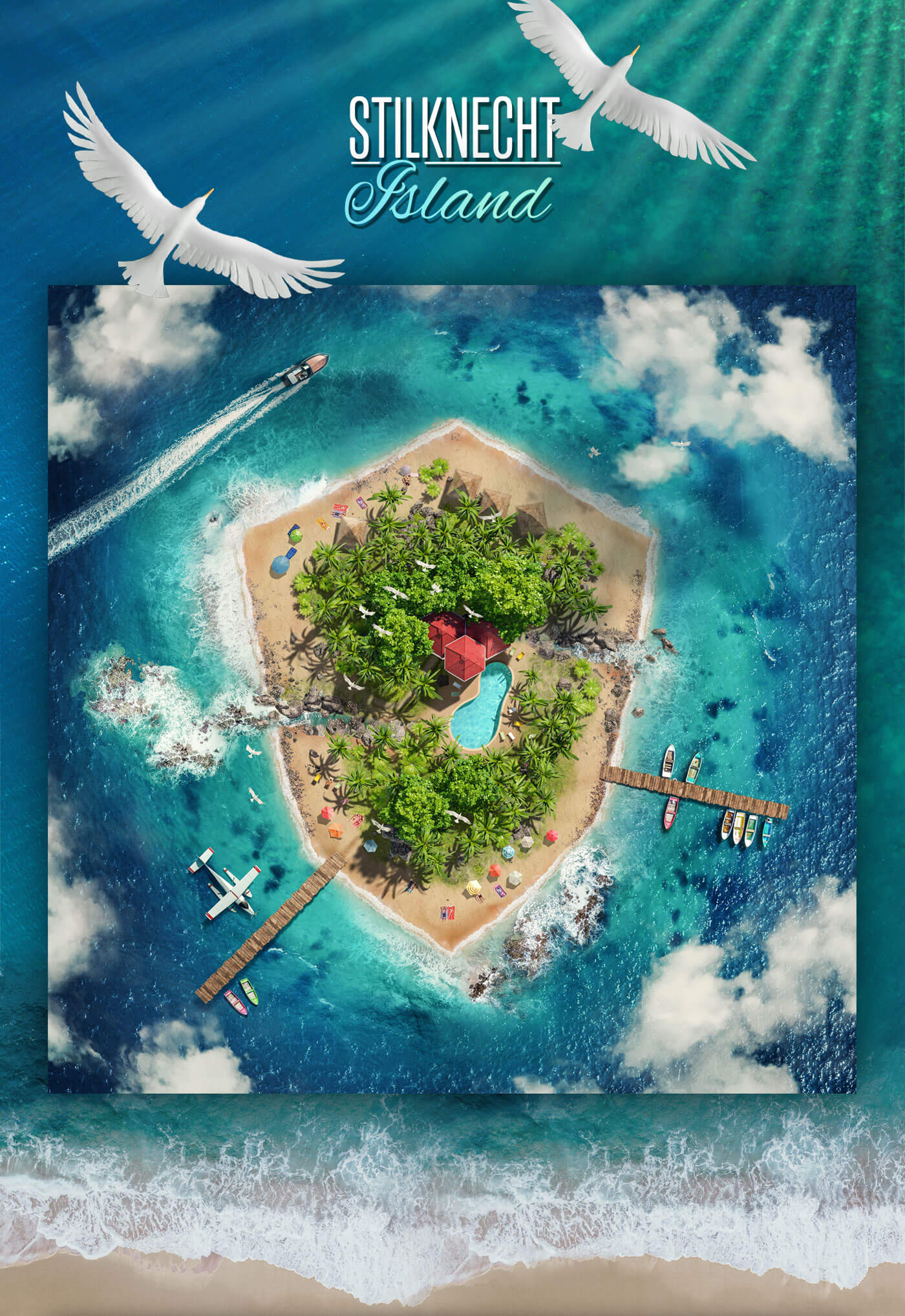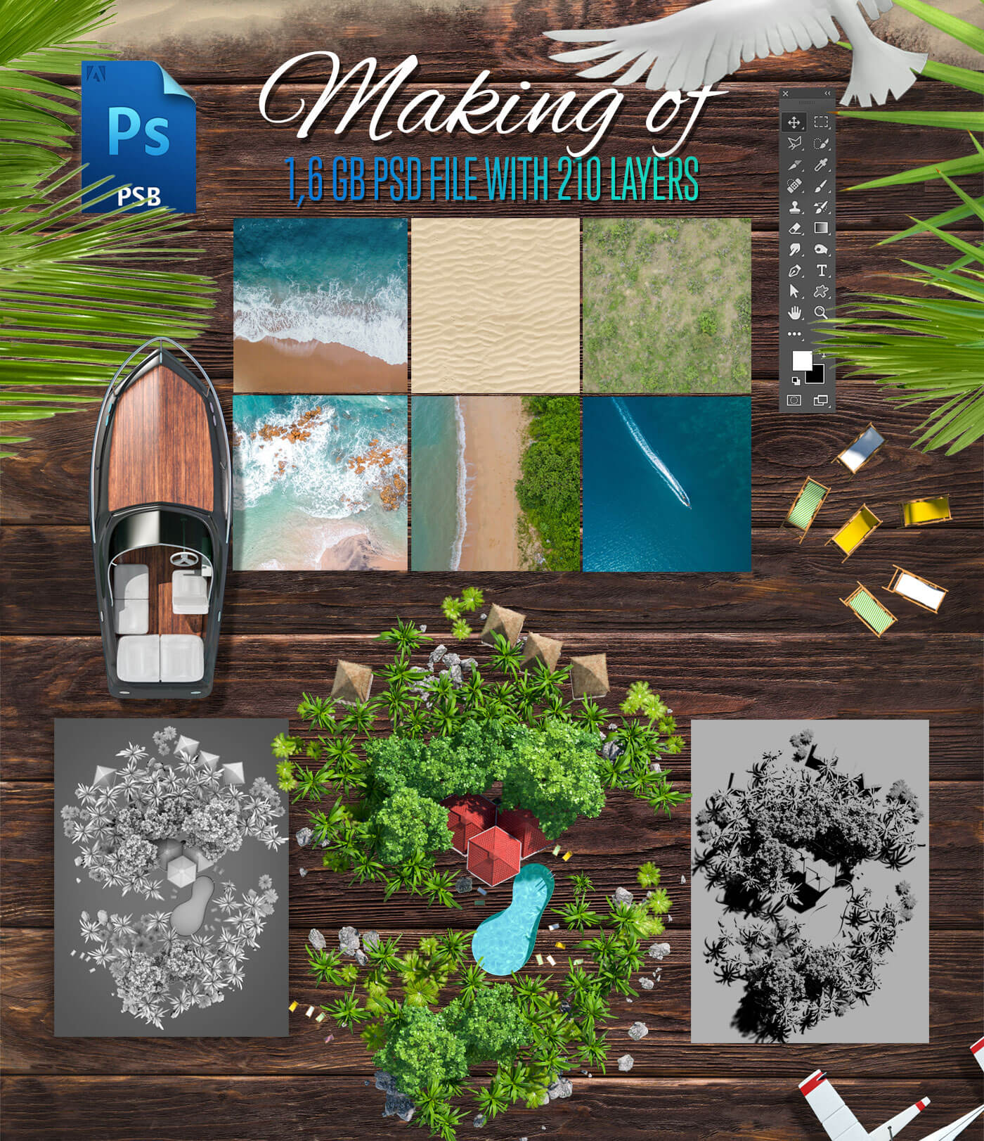 The idea was implemented with the help of stock images and 3D renderings. The inner part of the island with the palm trees, rocks, and architecture was visualized in 3D, rendered, and inserted into the visual during post-production in Photoshop using Creative Retouching. The surroundings, such as the beach and the sea, are real photos and were also used via digital image processing. In this case, the drone images are not from a photo shoot by Lauktien.Studio
