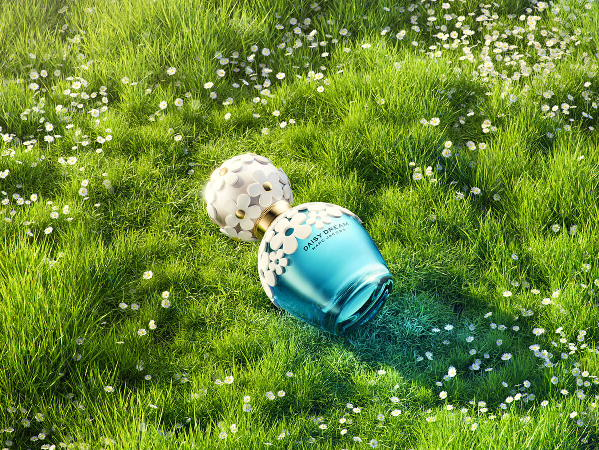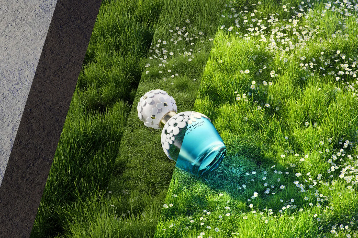 Amid a serene landscape of green grass and delicate daisies lies a bottle of Marc Jacobs perfume, shimmering seductively in the sunlight. What appears to be a real photograph is, in fact, a fully virtual creation — a masterpiece of CG product photography.