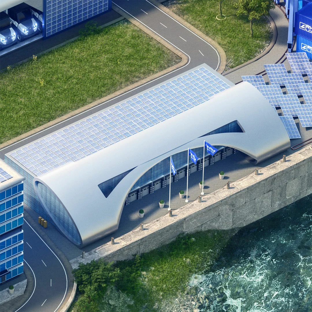 When designing the key visuals for this creative campaign, the aim was to translate one of our clients‘ sustainable approach into a 3D visualization. We took various letters from the client’s logo and developed a suitable slogan for each one. For example, “The S stands for solar energy.” This S was then architecturally implemented with many solar panels and alternative energy representations.